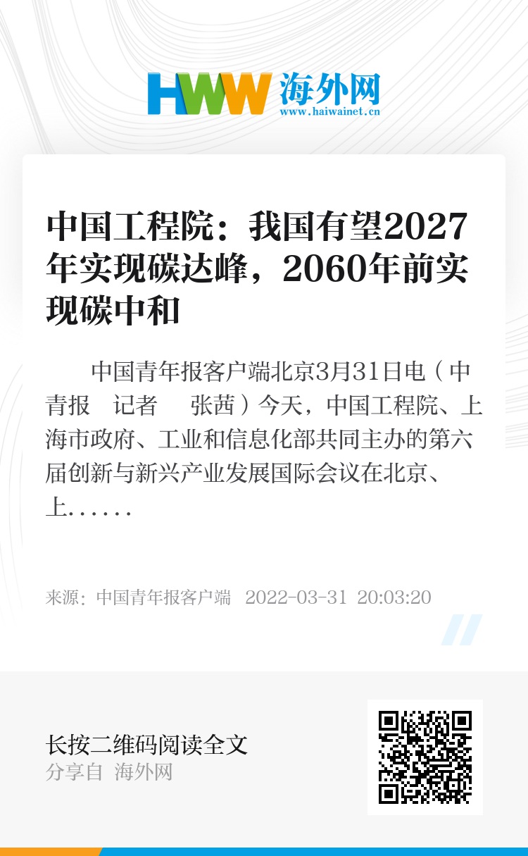 中国青年报客户端北京3月31日电(中青报・中青网记者 张茜)今天,中国工程院、上海市政府、工业和信息化部共同主办的第六届创新与新兴产业发展国际会议在北京、上海以线上线下结合的方式举行,中国工程院重大咨询研究成果《我国碳达峰碳中和战略及路径》在会上发布,该研究指出,我国二氧化碳排放有望于2027年左右实现达峰,峰值控制在122亿吨左右,在此基础上推动发展模式实现根本转变,可在2060年前实现碳中和。