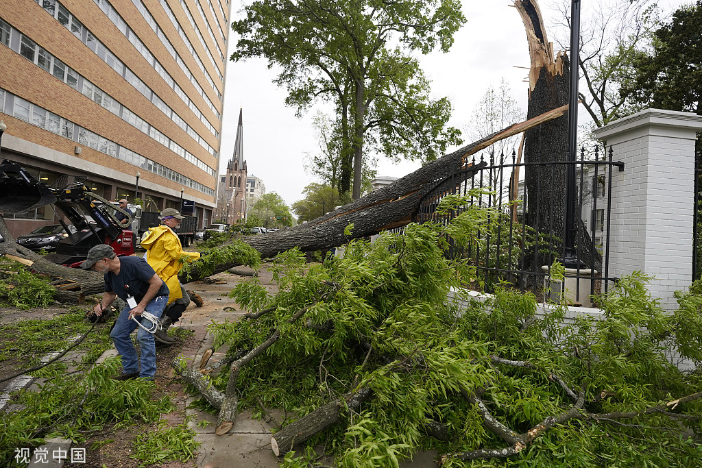 当地时间2022年3月30日,美国密西西比,当地遭遇龙卷风侵袭,市中心的树木被连根拔起。(图:视觉中国)
