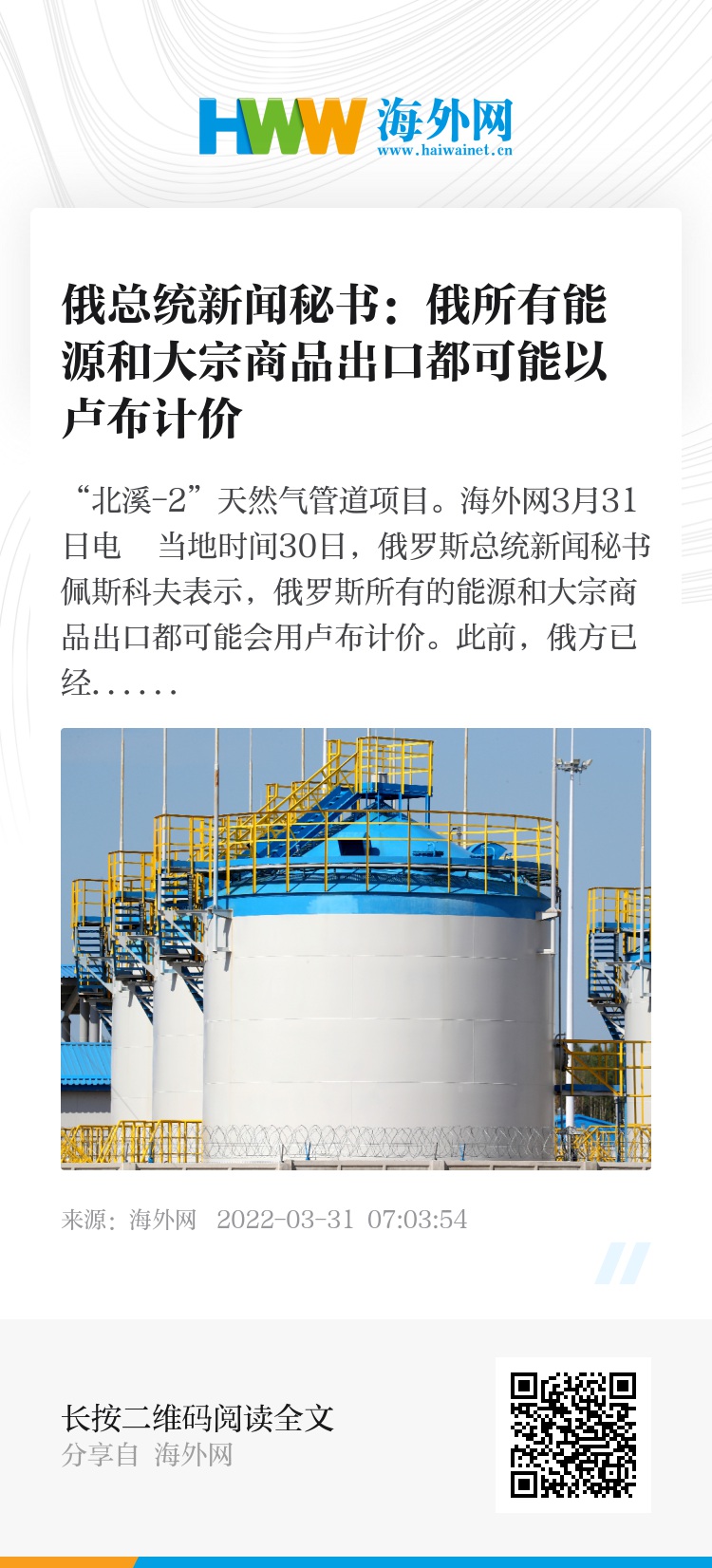 海外网3月31日电 当地时间30日,俄罗斯总统新闻秘书佩斯科夫表示,俄罗斯所有的能源和大宗商品出口都可能会用卢布计价。此前,俄方已经要求向“不友好国家”出口的天然气应以俄罗斯货币支付。