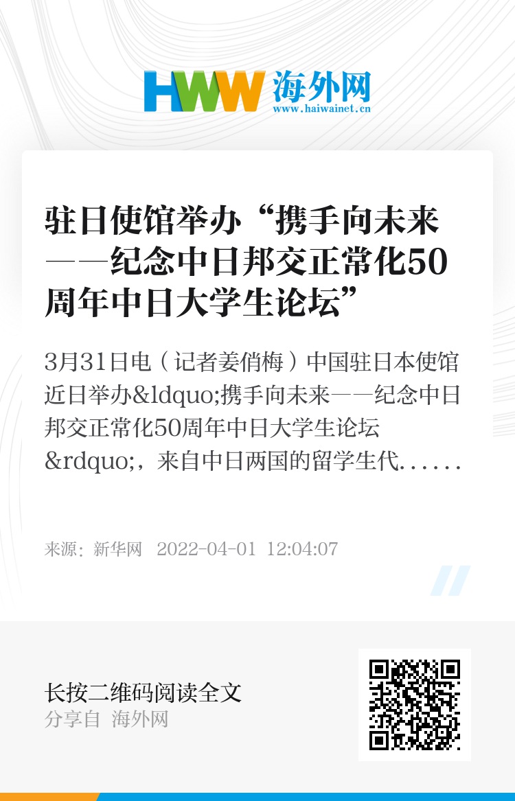 新华网3月31日电(记者姜俏梅)中国驻日本使馆近日举办“携手向未来――纪念中日邦交正常化50周年中日大学生论坛”,来自中日两国的留学生代表在线参会,纷纷表示愿为促进中日友好作贡献。