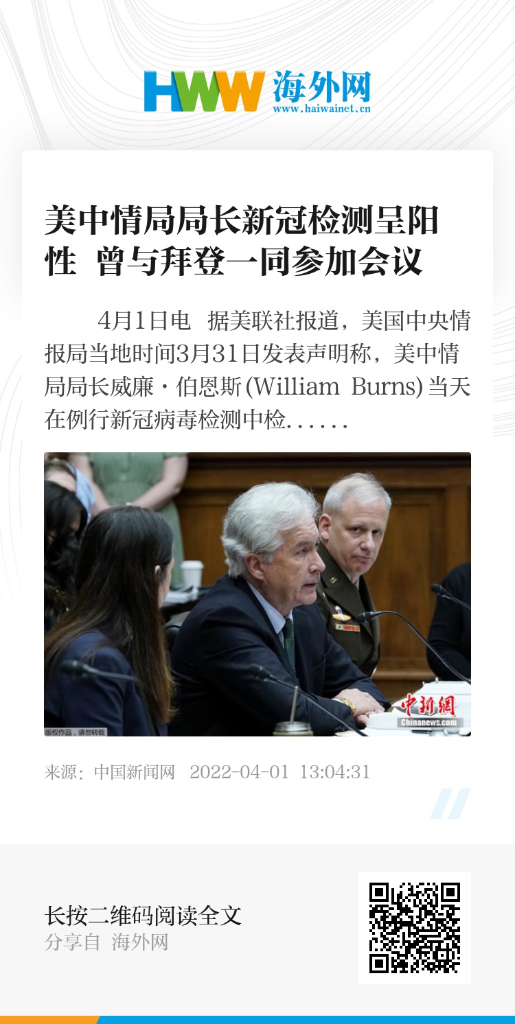 中新网4月1日电 据美联社报道,美国中央情报局当地时间3月31日发表声明称,美中情局局长威廉·伯恩斯(William Burns)当天在例行新冠病毒检测中检测结果呈阳性。