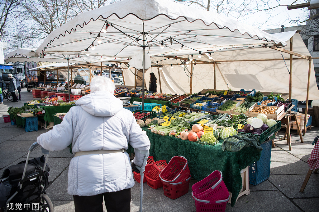 当地时间3月31日,德国柏林,当地民众在一处每周开放一次的露天市场选购商品。图片来源:视觉中国