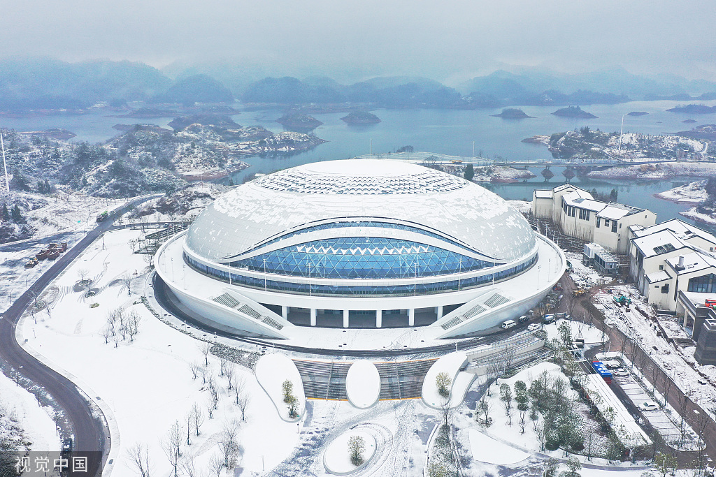 2022年2月23日清晨,位于在杭州淳安县界首乡的2022杭州亚运会淳安亚运分村白雪皑皑,千岛湖畔的亚运室内自行车场馆仿佛一颗“雪中明珠”,点缀着江南雪景,成为一道亮丽的风景线。图片来源:视觉中国