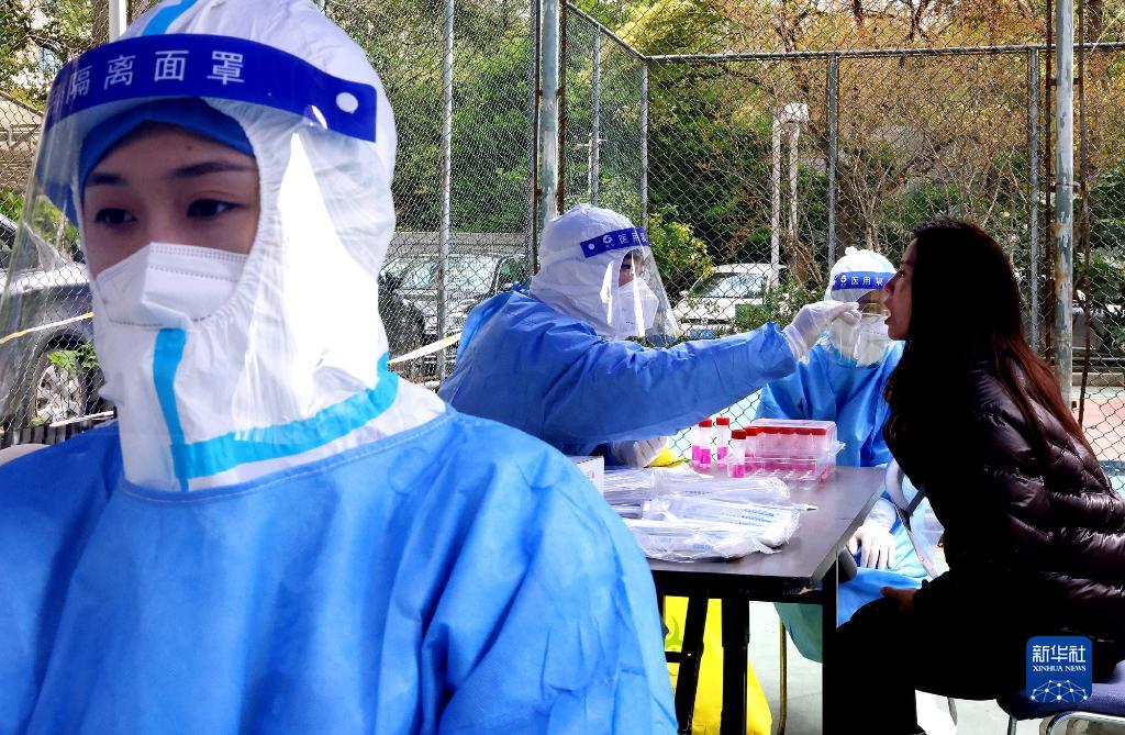4月1日,上海市普陀区长风新村锦绿居民区的居民在进行核酸采样。4月1日起,上海浦西地区的核酸筛查将全面展开。新华社记者 陈飞 摄
