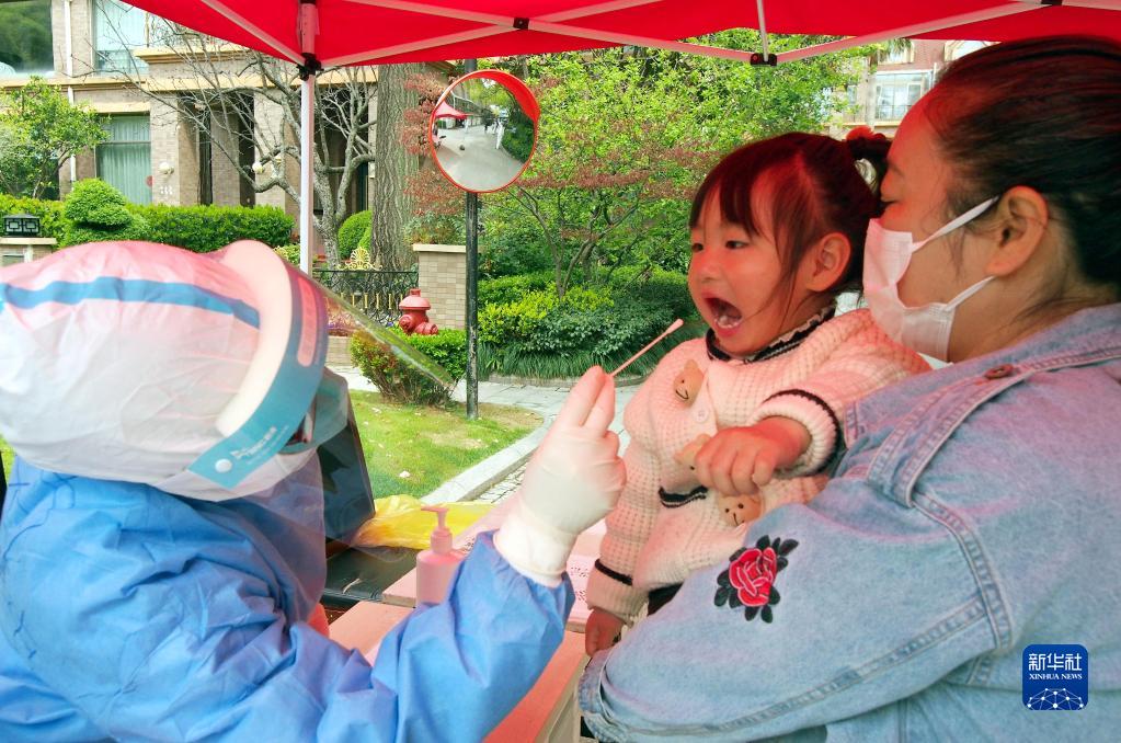 4月1日,检测人员在上海市闵行区虹桥镇某小区为居民进行核酸检测采样。4月1日起,上海浦西地区的核酸筛查将全面展开。新华社记者 任珑 摄