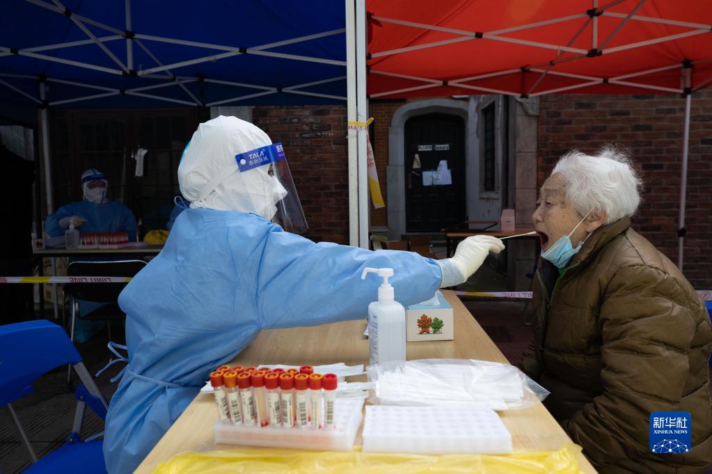 4月1日,在上海市长宁区江苏路街道岐山居民区,工作人员为居民进行核酸采样。4月1日起,上海浦西地区的核酸筛查将全面展开。新华社记者 金立旺 摄