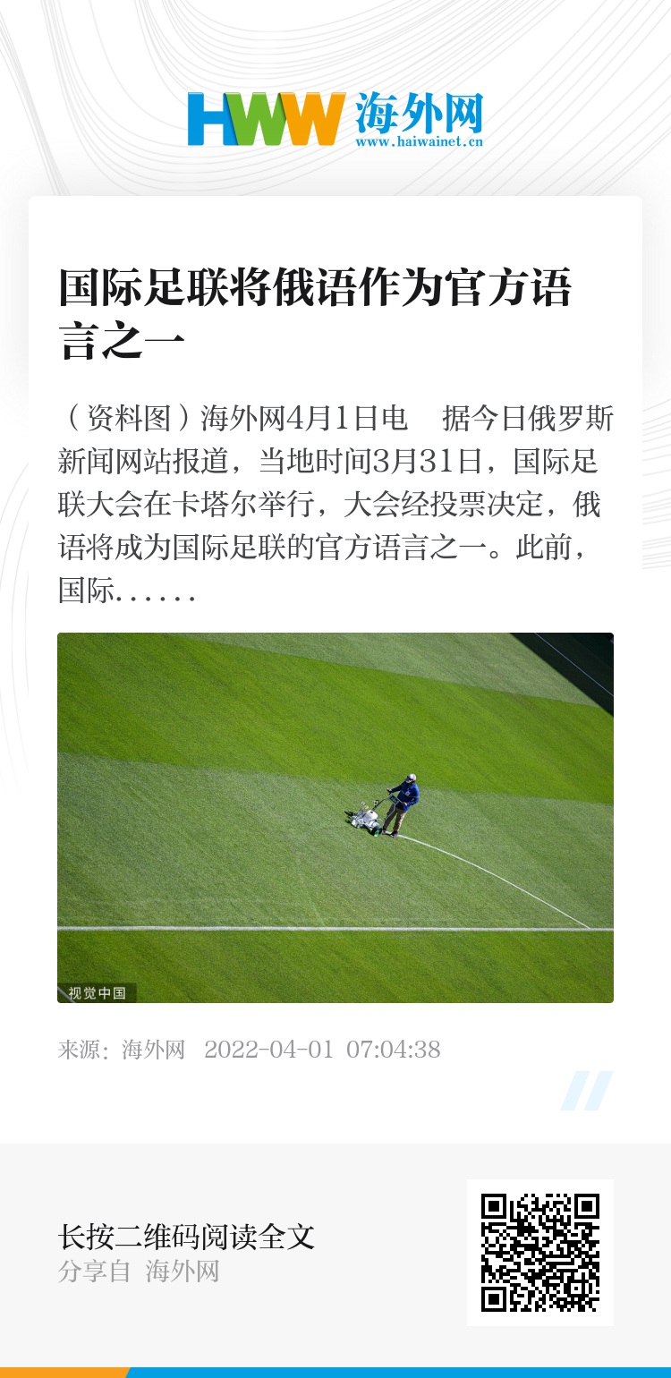 海外网4月1日电 据今日俄罗斯新闻网站报道,当地时间3月31日,国际足联大会在卡塔尔举行,大会经投票决定,俄语将成为国际足联的官方语言之一。