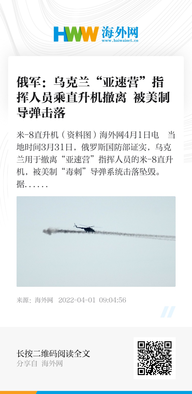 海外网4月1日电 当地时间3月31日,俄罗斯国防部证实,乌克兰用于撤离“亚速营”指挥人员的米-8直升机,被美制“毒刺”导弹系统击落坠毁。