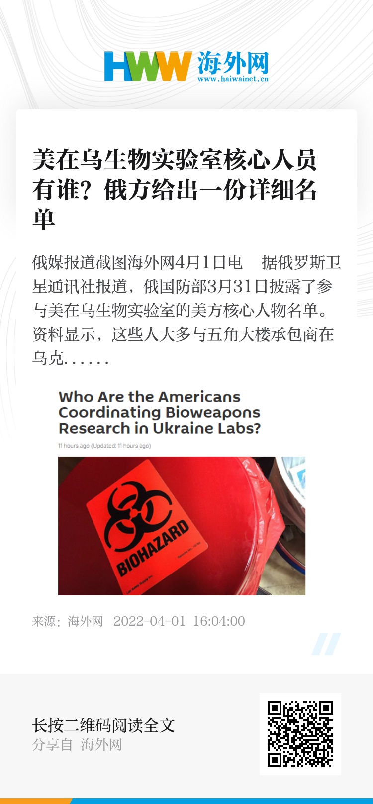 海外网4月1日电 据俄罗斯卫星通讯社报道,俄国防部3月31日披露了参与美在乌生物实验室的美方核心人物名单。资料显示,这些人大多与五角大楼承包商在乌克兰的生物研究项目有着密切联系,相关项目涉及病毒研究,还有包括在美国国防部威胁降低局(DTRA)任职的官员。人员名单如下: