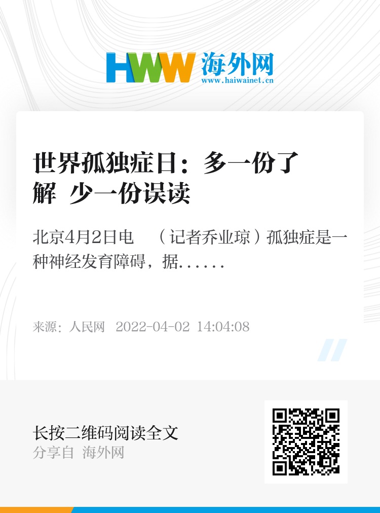 人民网北京4月2日电 (记者乔业琼)孤独症是一种神经发育障碍,据有关统计,我国孤独症患者可能超1000万。4月2日是“世界孤独症日”,让我们对他们的“孤独”多一份了解,少一份误读。