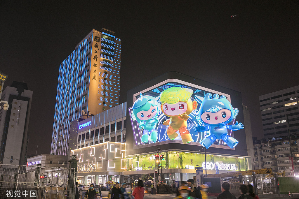 2022年4月1日,杭州亚运吉祥物裸眼3D宣传片在杭州市西湖区文三数字生活街区火热开播。这是杭州亚运吉祥物的3D形象首秀。图片来源:视觉中国