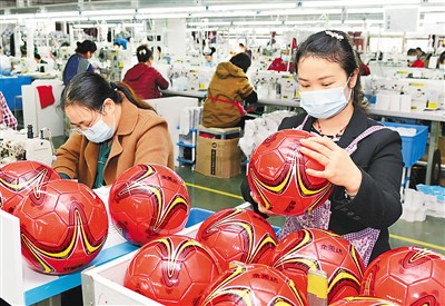 近期,湖南省邵阳市洞口农商银行通过调整信贷方式、延长授信期限等措施,帮助辖区中小微企业解决因疫情引起的短期资金周转困难。目前已为企业生产提供信贷资金2.6亿余元,助推县域经济平稳运行。图为3月31日,洞口县经开区一家公司员工在生产足球。 滕治中摄(人民视觉)