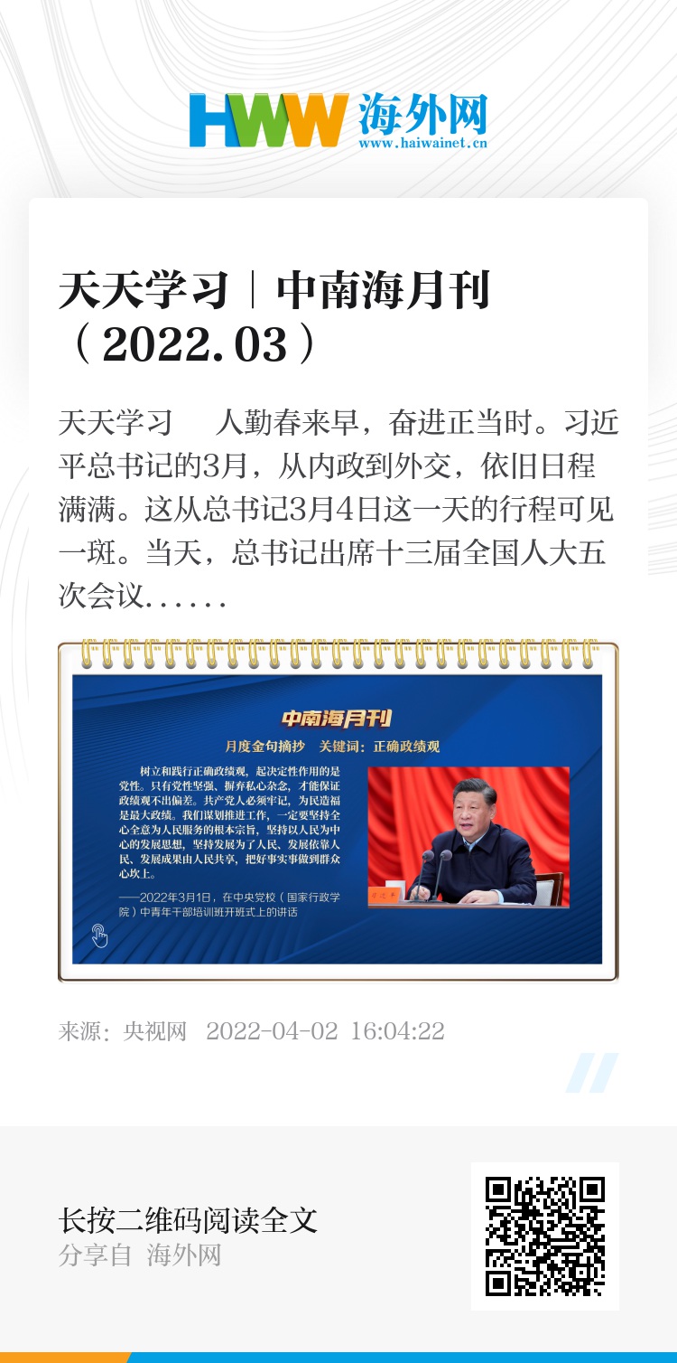 央视网《中南海月刊》运用智能大数据,梳理总书记2022年3月的重要活动与讲话,与您一起感悟总书记的人民情怀,领会总书记向世界传递的中国立场、中国强音。