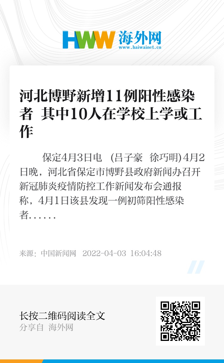 中新网保定4月3日电 (吕子豪 徐巧明)4月2日晚,河北省保定市博野县政府新闻办召开新冠肺炎疫情防控工作新闻发布会通报称,4月1日该县发现一例初筛阳性感染者,截至4月2日,共发现11例阳性感染者。目前,追踪到的密切接触者、次密切接触者已全部落实集中隔离医学观察措施。