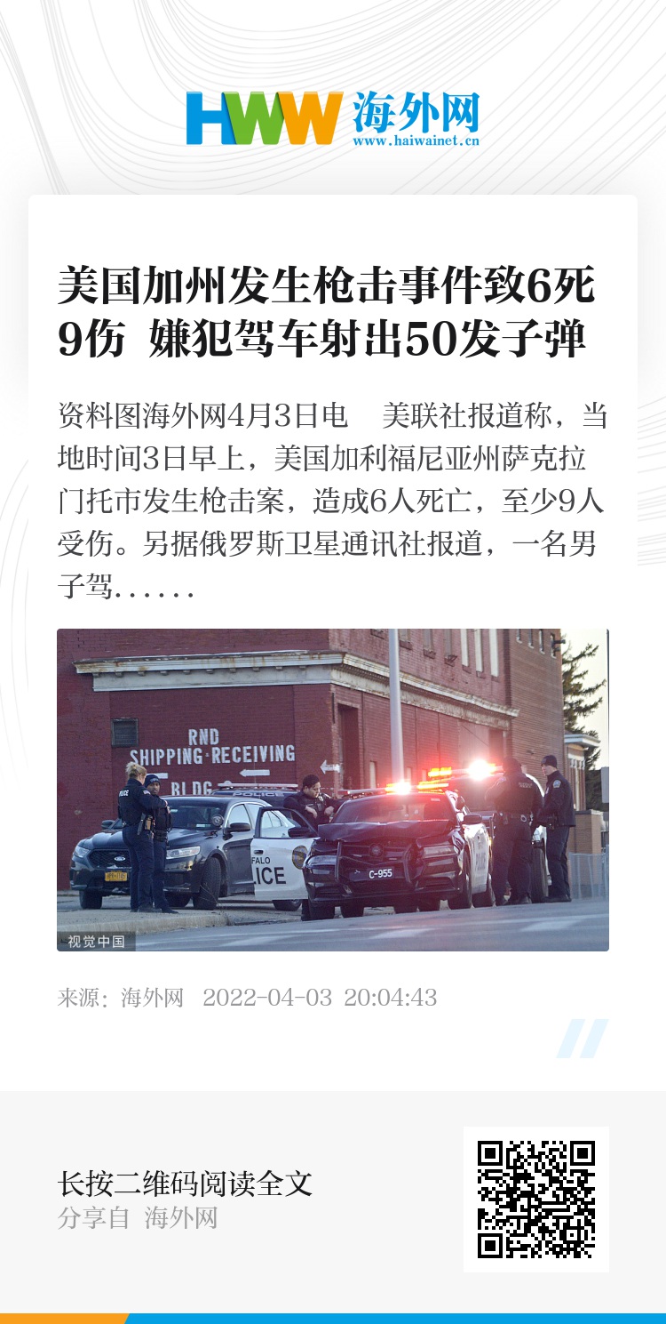 海外网4月3日电 美联社报道称,当地时间3日早上,美国加利福尼亚州萨克拉门托市发生枪击案,造成6人死亡,至少9人受伤。