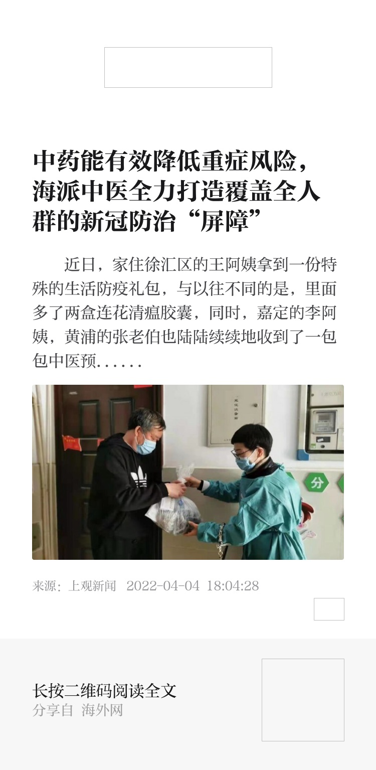 近日,家住徐汇区的王阿姨拿到一份特殊的生活防疫礼包,与以往不同的是,里面多了两盒连花清瘟胶囊,同时,嘉定的李阿姨,黄浦的张老伯也陆陆续续地收到了一包包中医预防代茶饮,……这正得益于上海正在推进的全人群、全覆盖中医预防方药发放行动,一丝丝药香传递着浓浓的抗疫温情。