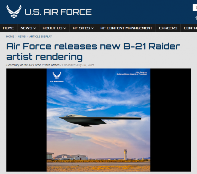 美国空军在其官网发布的B-21轰炸机艺术渲染图(美国空军官网截图)