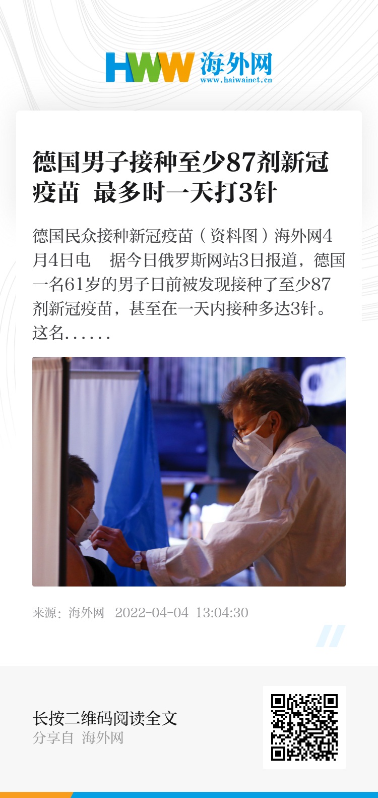 海外网4月4日电 据今日俄罗斯网站3日报道,德国一名61岁的男子日前被发现接种了至少87剂新冠疫苗,甚至在一天内接种多达3针。