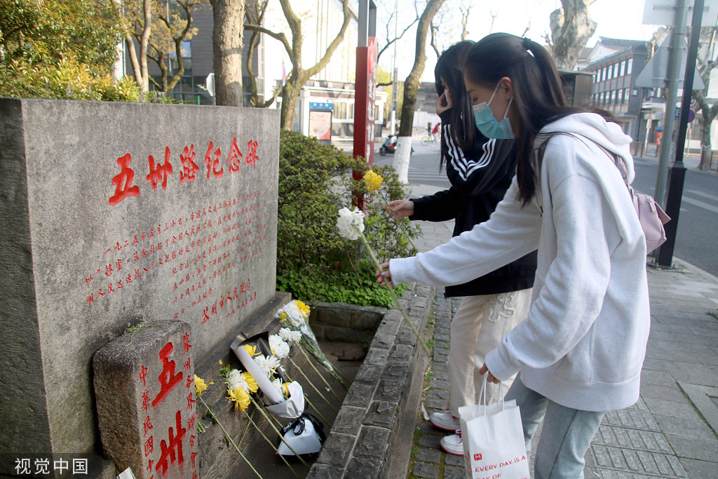 ​4月5日,清明节当天,市民自发来到江苏省苏州市五卅路纪念碑前,缅怀革命先烈,用鲜花寄托哀思。图片来源:视觉中国