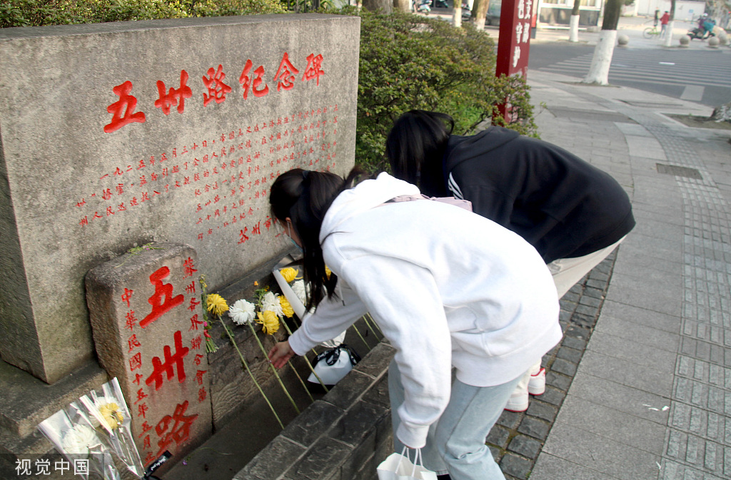 ​4月5日,清明节当天,市民自发来到江苏省苏州市五卅路纪念碑前,缅怀革命先烈,用鲜花寄托哀思。图片来源:视觉中国