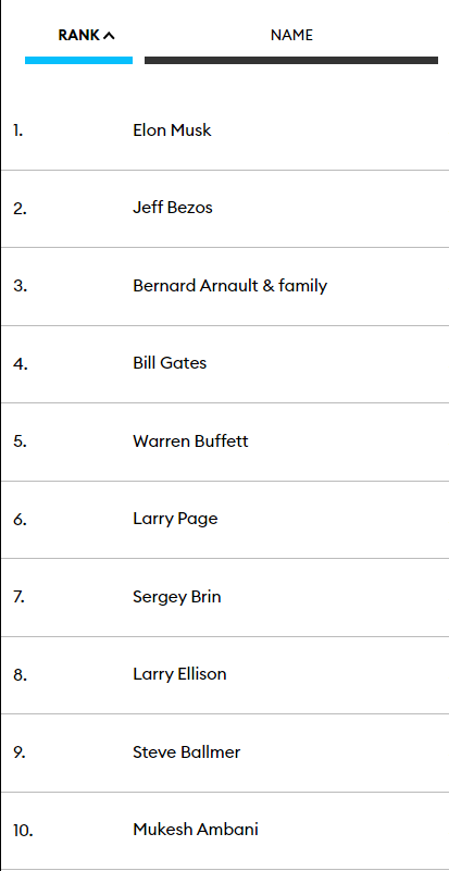 《福布斯》杂志全球富豪榜实时排名 此外,马斯克的身家也远远超过了微软公司两位前首席执行官比尔·盖茨(Bill Gates)和史蒂夫·鲍尔默(Steve Ballmer)的财富总和,二者身家分别为1360亿美元和1000亿美元。而谷歌公司联合创始人拉里·佩奇(Larry Page)和谢尔盖·布林(Sergey Brin)的净资产加一起也没有马斯克一人的多,两人财富值分别为1200亿美元和1150亿美元。