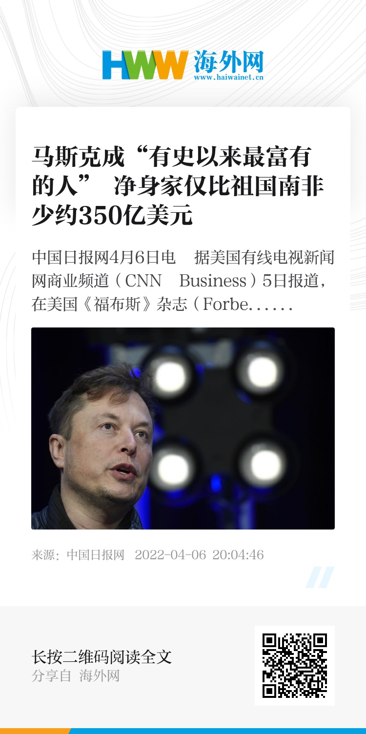 中国日报网4月6日电 据美国有线电视新闻网商业频道(CNN Business)5日报道,在美国《福布斯》杂志(Forbes)公布的全球富豪榜实时排名中,特斯拉公司(TSLA)和太空探索技术公司(SpaceX)首席执行官埃隆·马斯克(Elon Musk)以约3000亿美元(约合19095.9亿元人民币)的净资产登顶。