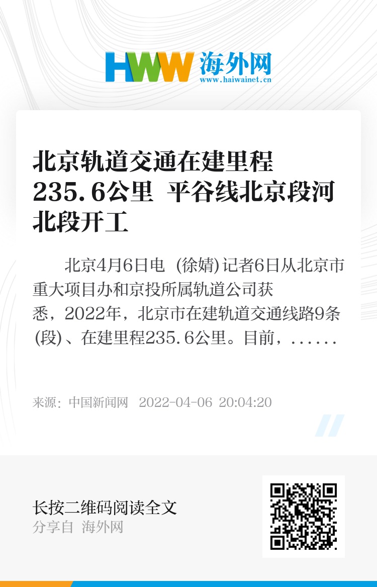 中新网北京4月6日电 (徐婧)记者6日从北京市重大项目办和京投所属轨道公司获悉,2022年,北京市在建轨道交通线路9条(段)、在建里程235.6公里。目前,所有在建工程均全面开工建设,一季度已完成全年投资目标的21.2%,超额完成原计划的17%,实现了“开门红”。