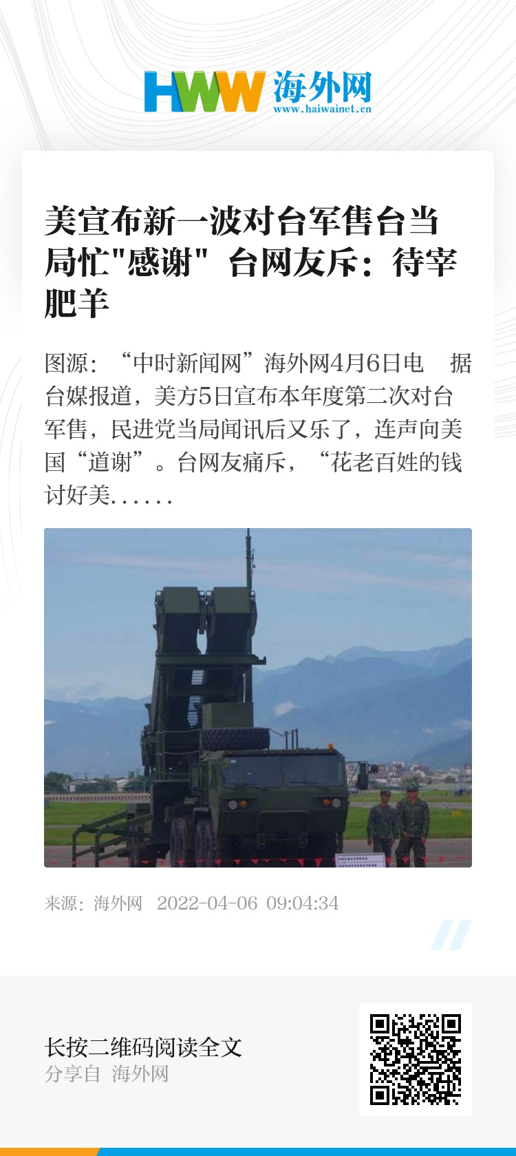 海外网4月6日电 据台媒报道,美方5日宣布本年度第二次对台军售,民进党当局闻讯后又乐了,连声向美国“道谢”。台网友痛斥,“花老百姓的钱讨好美国毫不手软”“智者应避战而非求战”。