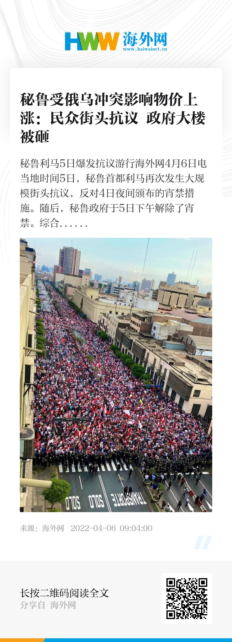 综合路透社和秘鲁《商报》5日报道,秘鲁物价上涨,3月通胀率升至26年来最高,达到1.48%。秘鲁多地爆发交通运输罢工抗议,抗议中出现暴力事件,内政部5日表示,暴力导致3人死亡、多人受伤。随后,秘鲁总统卡斯蒂略于4日夜里紧急宣布利马和卡亚俄5日凌晨2时至23时59分实施宵禁,但宵禁期间仍有上千民众上街抗议,并与警方发生冲突。国会、地方政府及各类工会组织也反对宵禁。在此情况下,秘鲁政府取消了宵禁。