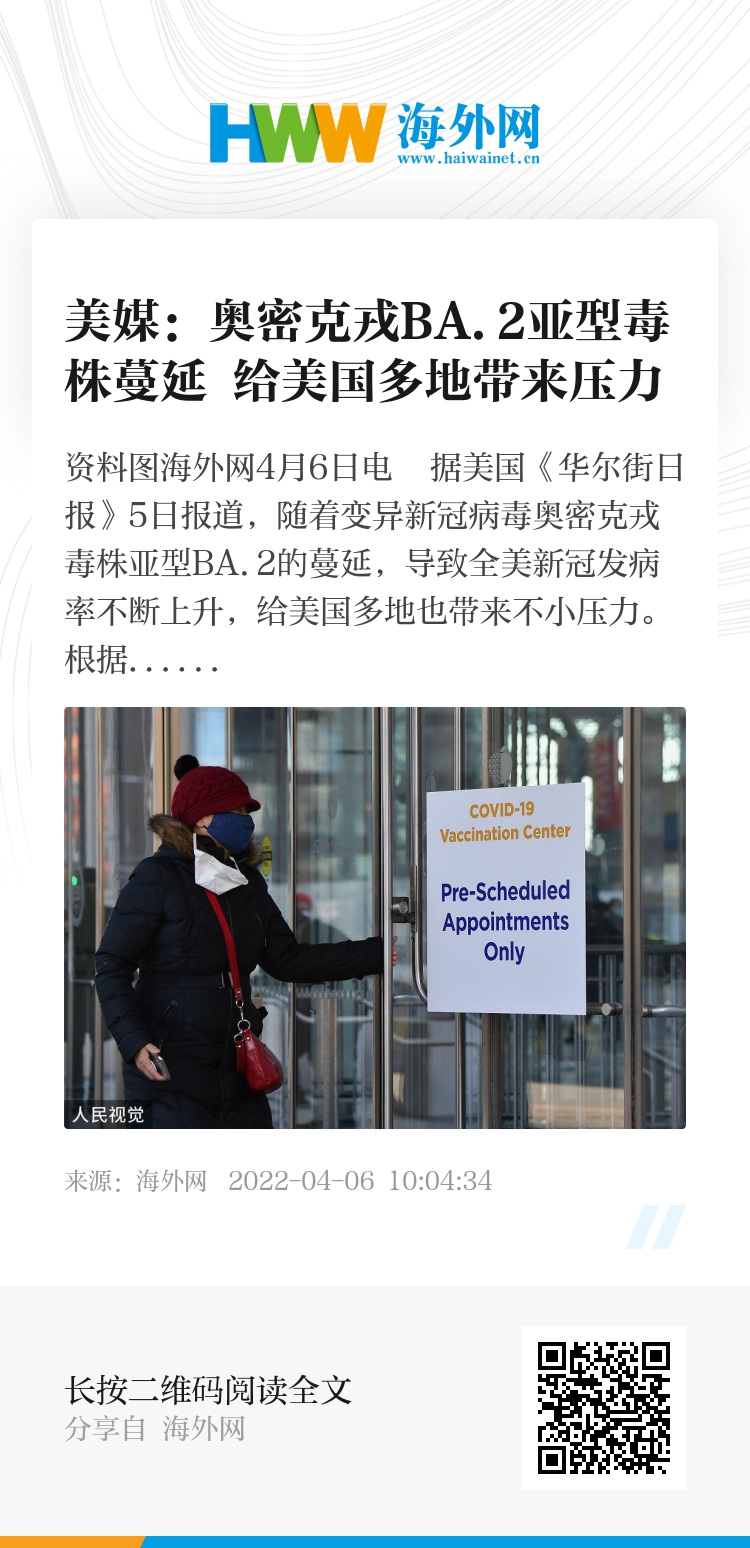 海外网4月6日电 据美国《华尔街日报》5日报道,随着变异新冠病毒奥密克戎毒株亚型BA.2的蔓延,导致全美新冠发病率不断上升,给美国多地也带来不小压力。