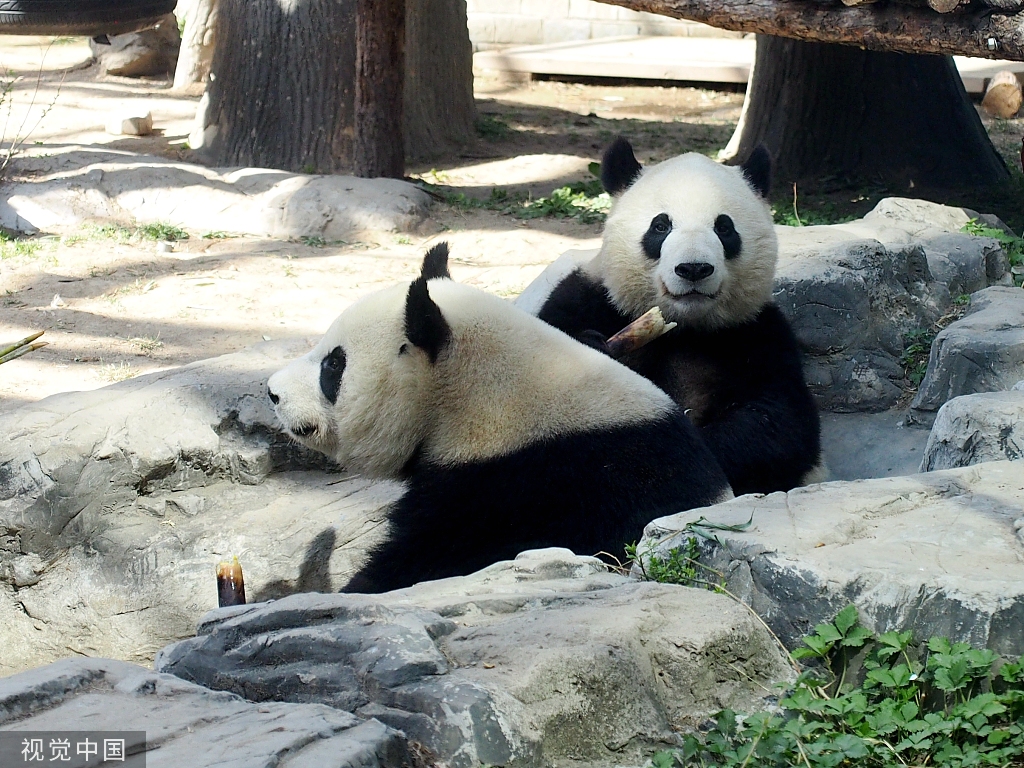 2022年4月6日,北京动物园的大熊猫双胞胎姐妹萌宝和萌玉相互依偎,萌态十足。图源:视觉中国