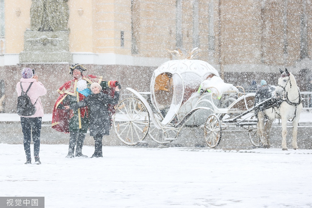 俄罗斯圣彼得堡迎来强降雪天气 皑皑白雪一片纯白世界