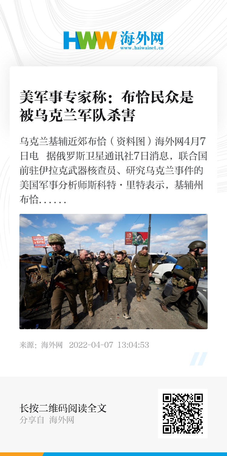 海外网4月7日电 据俄罗斯卫星通讯社7日消息,联合国前驻伊拉克武器核查员、研究乌克兰事件的美国军事分析师斯科特·里特表示,基辅州布恰市的居民系死于乌克兰军方之手。他同时指出,俄罗斯军方表示,俄军在布恰停留数周期间,军人与当地居民关系良好。