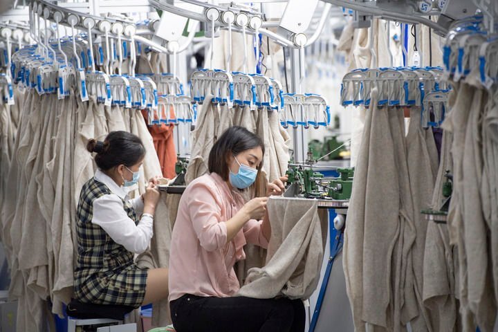 4月6日,在福建泉州南安市的一家电脑针织有限公司,工人在加工外贸针织衫。新华社发(王毅摄)