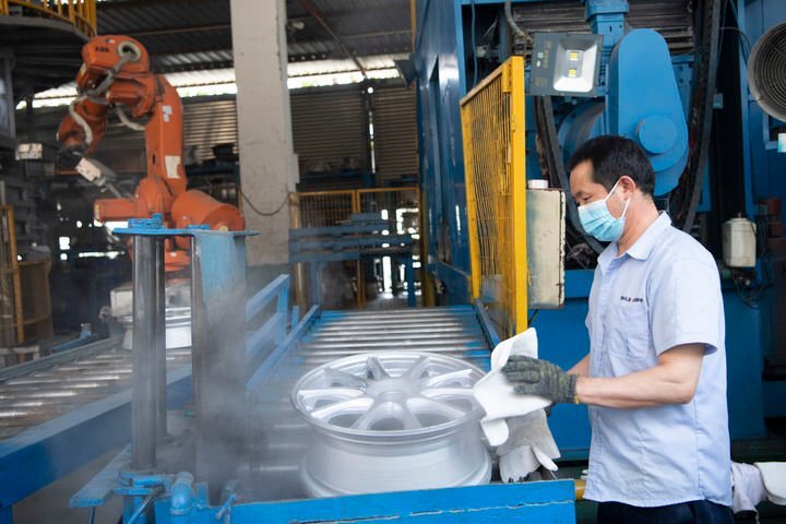 4月6日,在福建泉州南安市的一家铝业发展有限公司,工人在加工出口汽车铝合金轮毂。新华社发(王毅摄)