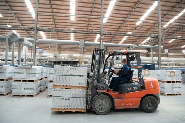 4月6日,在福建泉州南安市的一家建材有限公司,工人在装运出口瓷砖产品。
