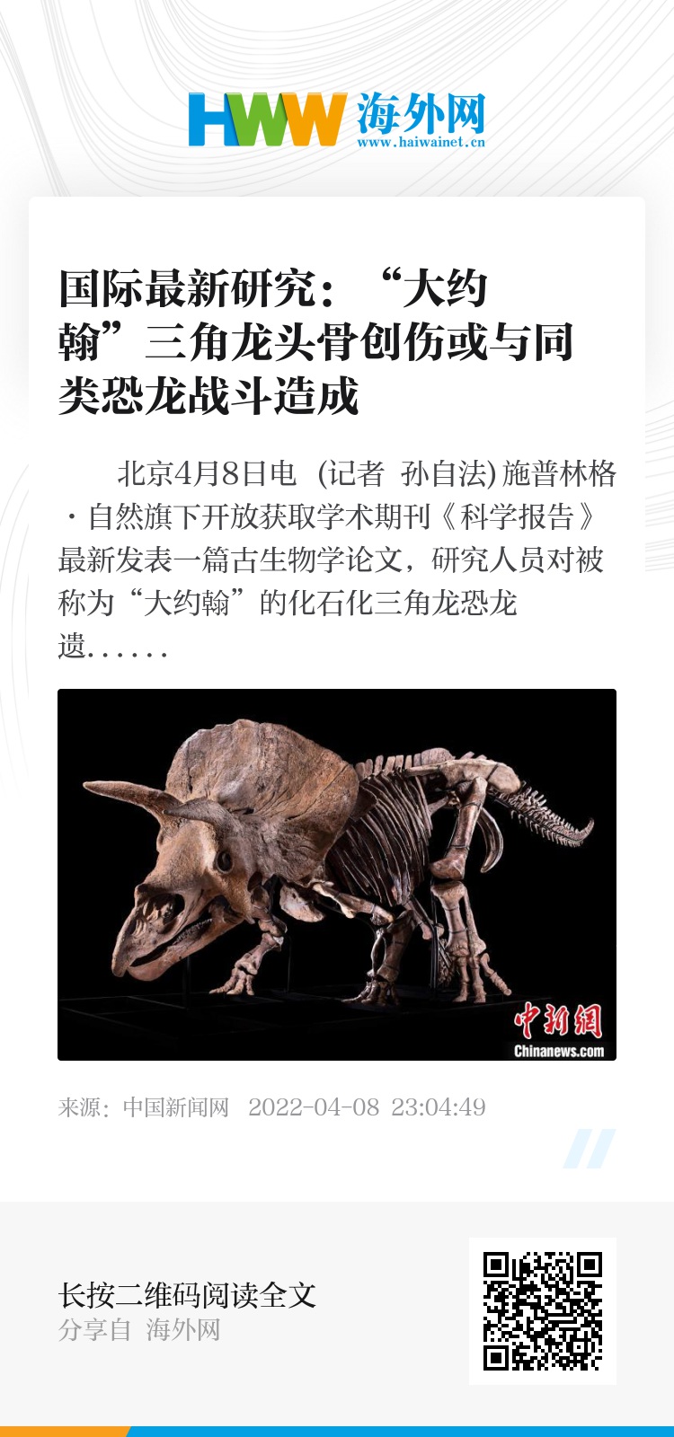 中新网北京4月8日电 (记者 孙自法)施普林格·自然旗下开放获取学术期刊《科学报告》最新发表一篇古生物学论文,研究人员对被称为“大约翰”的化石化三角龙恐龙遗骸标本进行分析,认为其头骨创伤可能是与其他三角龙战斗造成的。