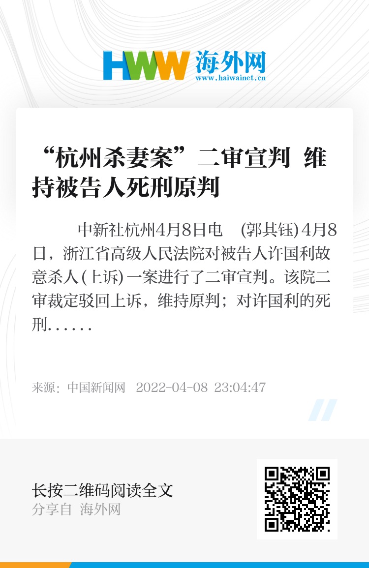 中新社杭州4月8日电 (郭其钰)4月8日,浙江省高级人民法院对被告人许国利故意杀人(上诉)一案进行了二审宣判。该院二审裁定驳回上诉,维持原判;对许国利的死刑判决,依法报请最高人民法院核准。