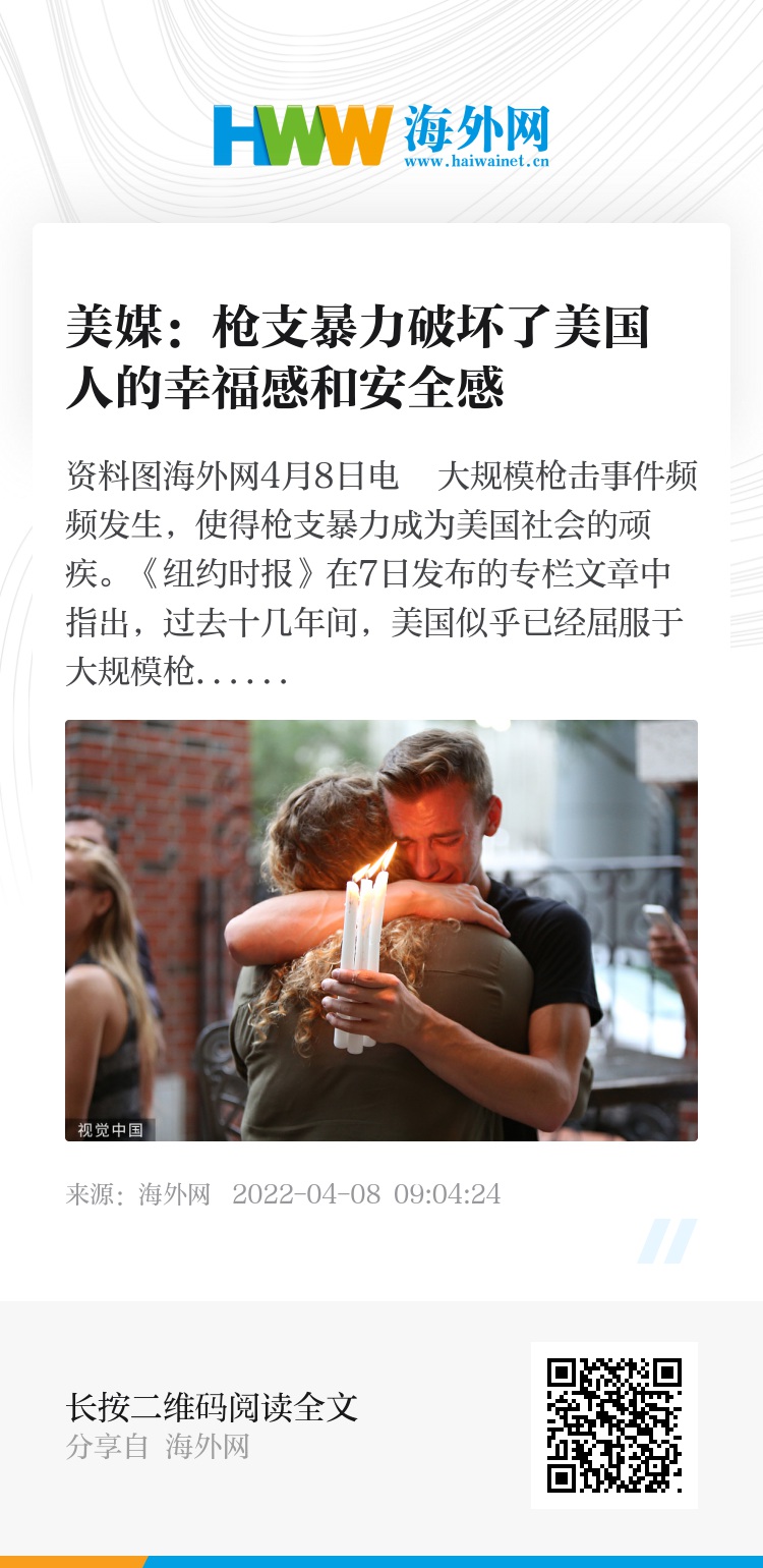 海外网4月8日电 大规模枪击事件频频发生,使得枪支暴力成为美国社会的顽疾。《纽约时报》在7日发布的专栏文章中指出,过去十几年间,美国似乎已经屈服于大规模枪击事件,将其视为一种不可避免的自然灾害,一系列枪支暴力事件破坏了美国人的幸福感和安全感。