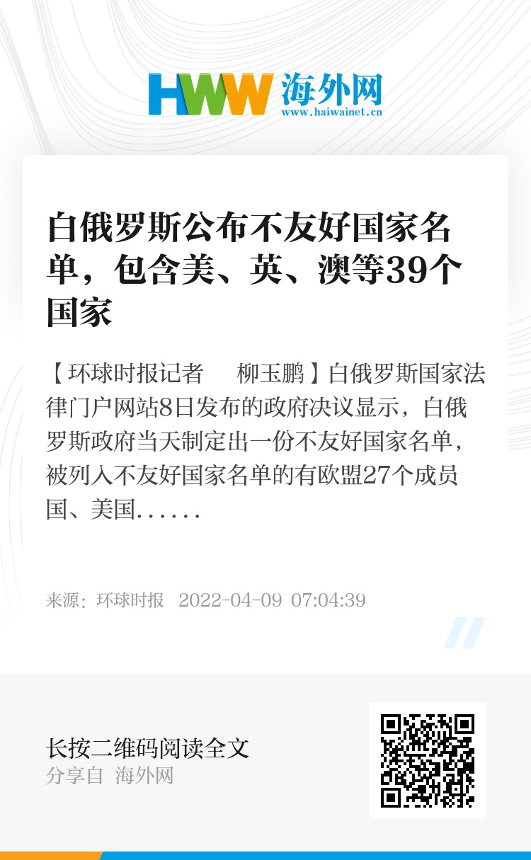 【环球时报记者 柳玉鹏】白俄罗斯国家法律门户网站8日发布的政府决议显示,白俄罗斯政府当天制定出一份不友好国家名单,被列入不友好国家名单的有欧盟27个成员国、美国、英国、澳大利亚、加拿大、列支敦士登、挪威、新西兰、阿尔巴尼亚、冰岛、北马其顿、黑山以及瑞士,共计39个国家。白俄罗斯通讯社8日报道称,白俄罗斯的这份名单比俄罗斯类似名单中的国家和地区少了9 个。