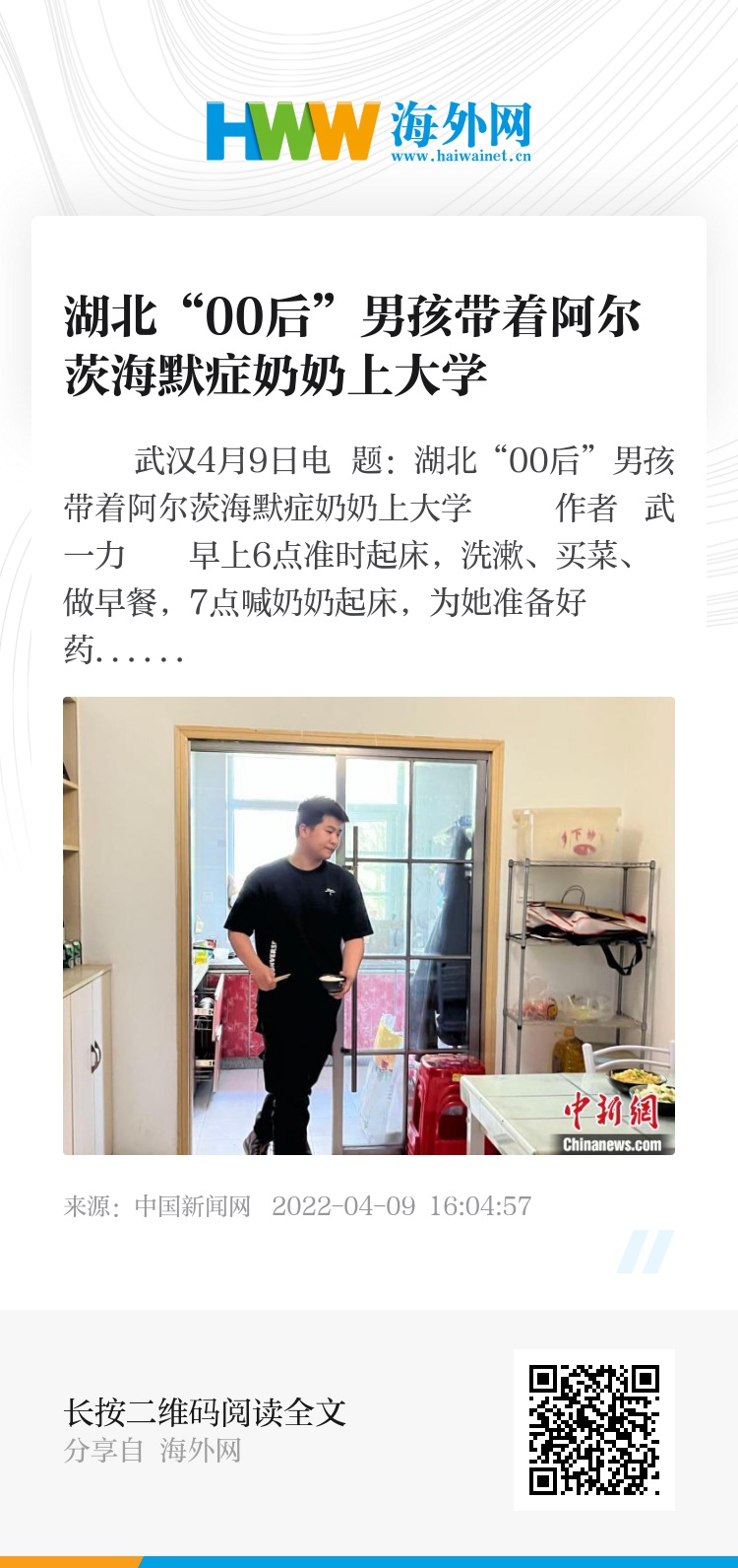 中新网武汉4月9日电 题:湖北“00后”男孩带着阿尔茨海默症奶奶上大学