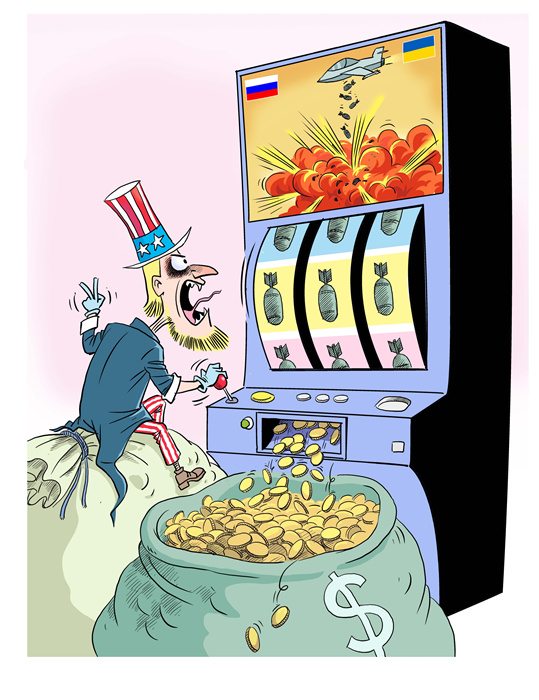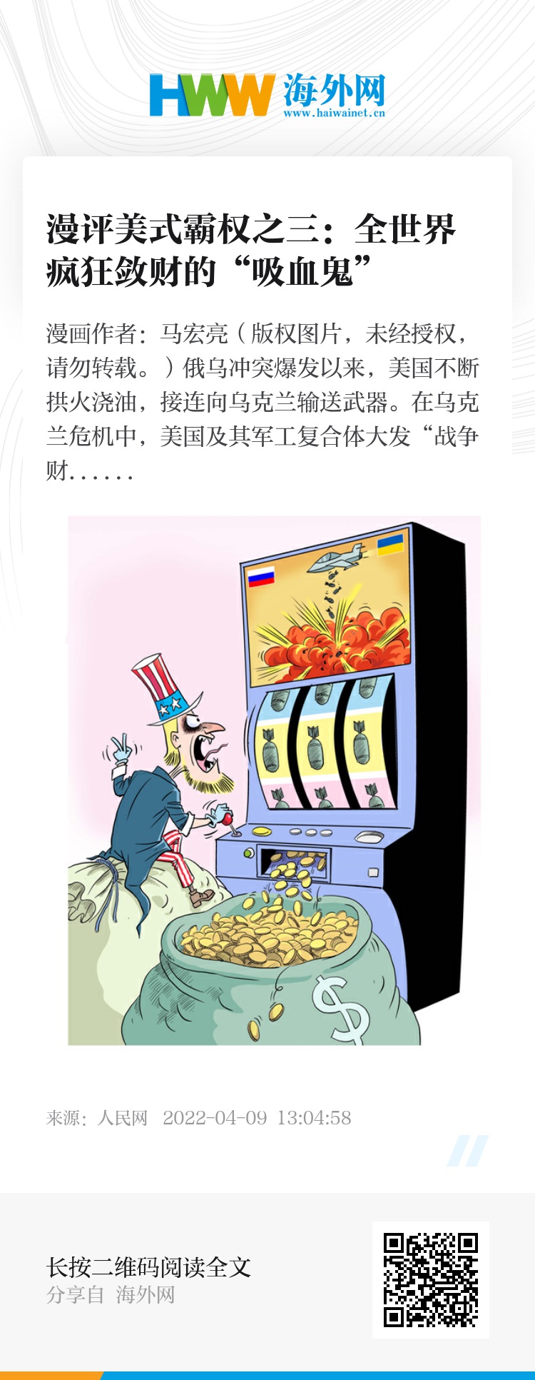 美国不断挑起战争:海湾战争、科索沃战争、阿富汗战争、伊拉克战争……所有人都为此付出了代价,只有控制着美国政客的军工复合体赢了——他们以他国生灵涂炭换来了自己的盆满钵满。美国是名副其实在世界范围内疯狂敛财的“吸血鬼”。(陈籽)