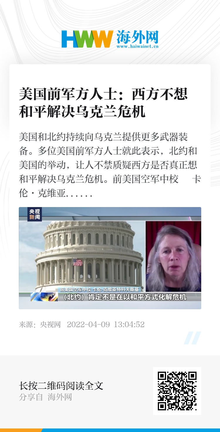 前美国空军中校 卡伦·克维亚特科夫斯基:(北约)肯定不是在以和平方式化解危机,他们也并不是在帮助乌克兰人民。美国似乎是想在乌克兰问题上持续牵制住俄罗斯,以民众的生命为代价。西方自称是自由贸易的灯塔,却没有真正在践行这样的理念。