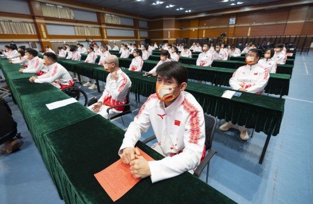 2月21日,在北京顺义区中国残疾人体育运动管理中心,运动员出席北京2022年冬残奥会中国体育代表团出征动员大会。新华社记者才扬摄