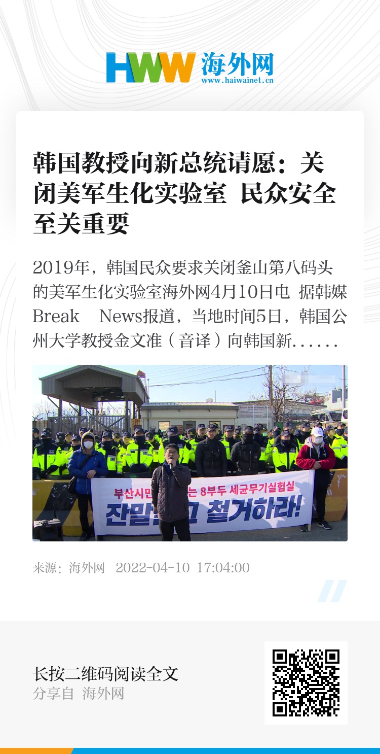 海外网4月10日电 据韩媒Break News报道,当地时间5日,韩国公州大学教授金文准(音译)向韩国新总统尹锡悦递交请愿书,呼吁关闭美军基地生化实验室,修改不平等的《驻韩美军地位协定》,并解决美军所归还基地的重金属污染问题。