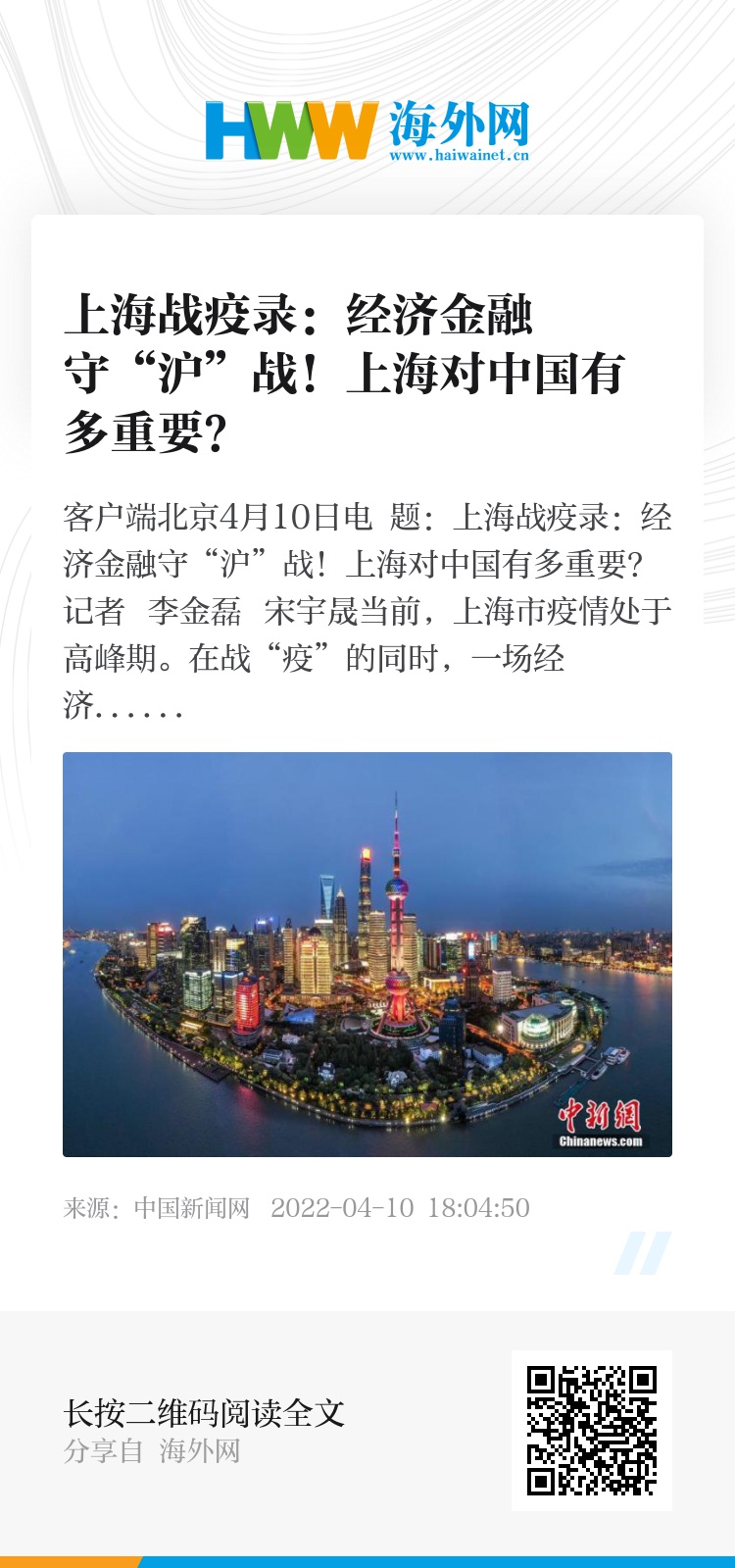 中新网客户端北京4月10日电 题:上海战疫录:经济金融守“沪”战!上海对中国有多重要?