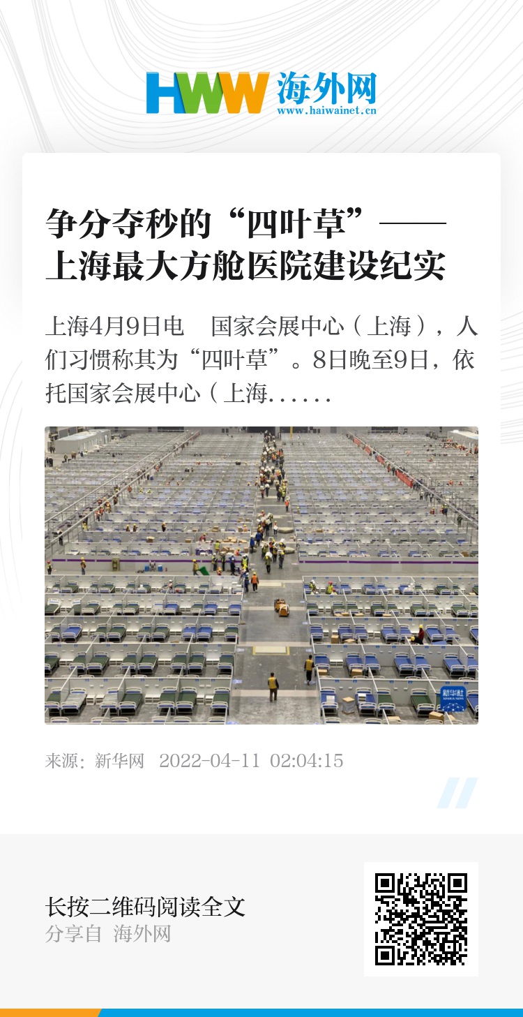 新华社上海4月9日电 国家会展中心(上海),人们习惯称其为“四叶草”。8日晚至9日,依托国家会展中心(上海)建设的目前上海最大的方舱医院各场馆陆续完工、分批交付。