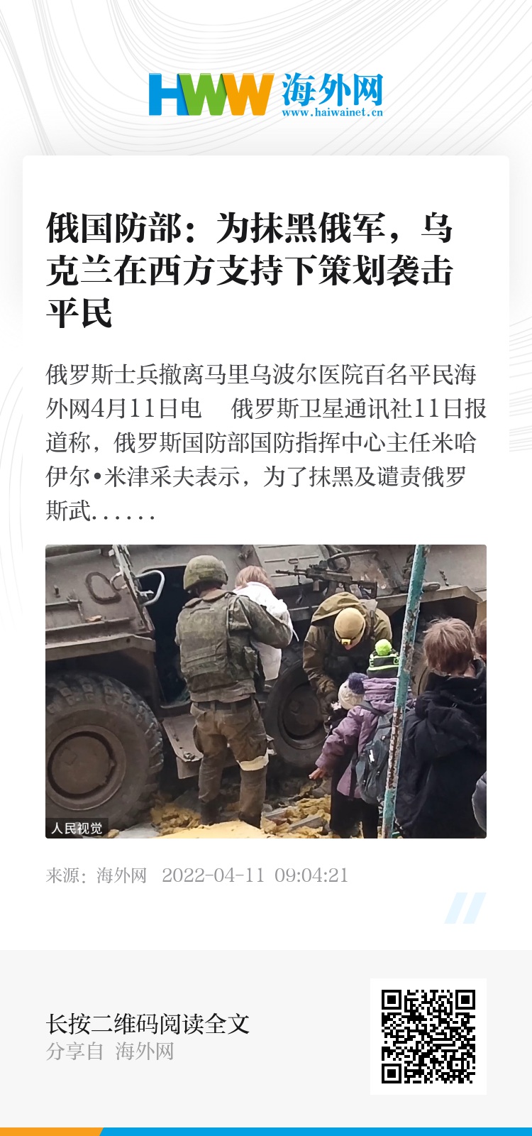 俄罗斯士兵撤离马里乌波尔医院百名平民