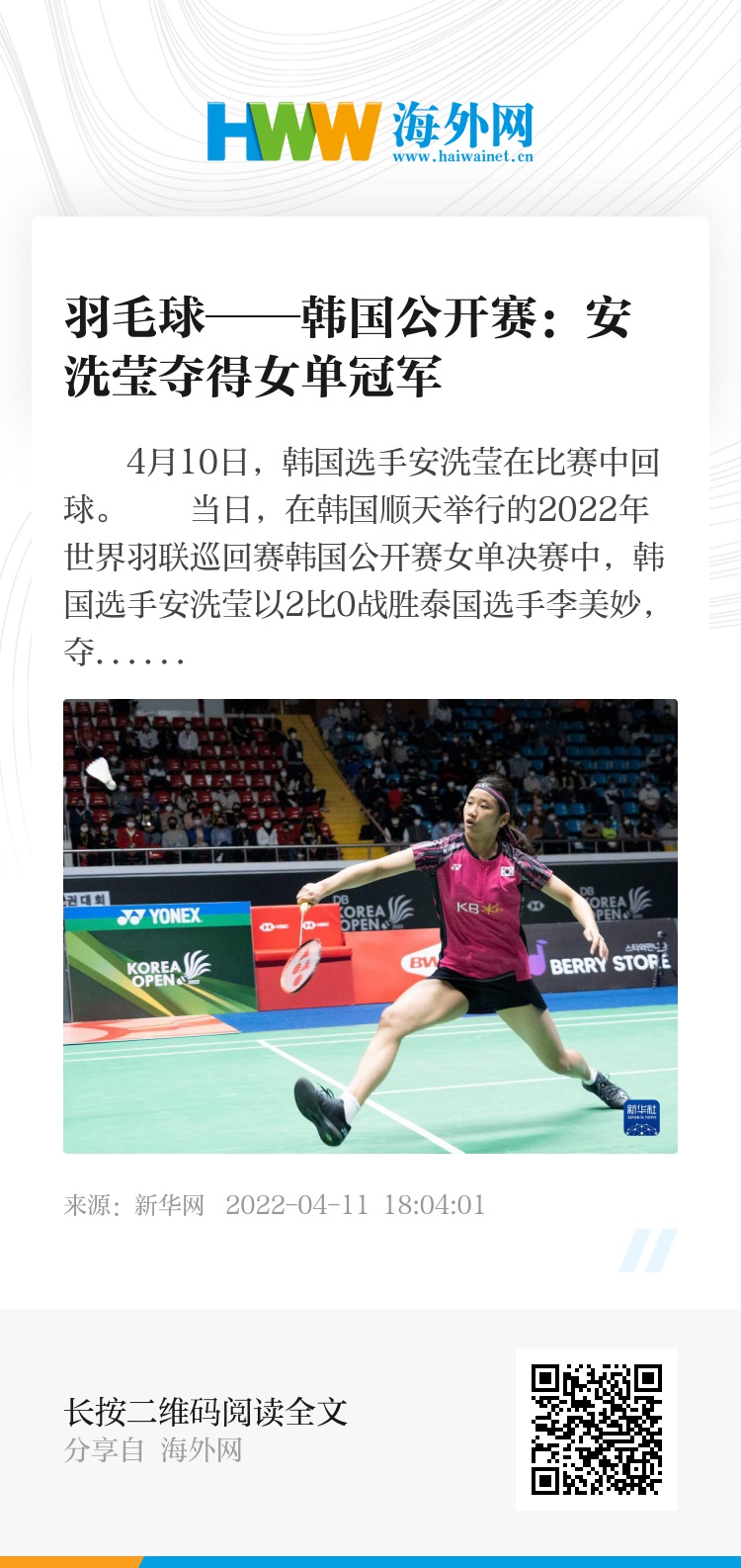 当日,在韩国顺天举行的2022年世界羽联巡回赛韩国公开赛女单决赛中,韩国选手安洗莹以2比0战胜泰国选手李美妙,夺得冠军。
