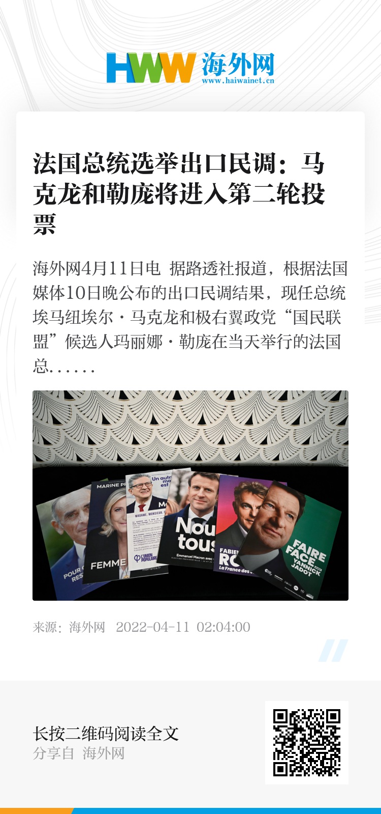 海外网4月11日电 据路透社报道,根据法国媒体10日晚公布的出口民调结果,现任总统埃马纽埃尔·马克龙和极右翼政党“国民联盟”候选人玛丽娜·勒庞在当天举行的法国总统选举首轮投票中得票领先,将进入第二轮投票。